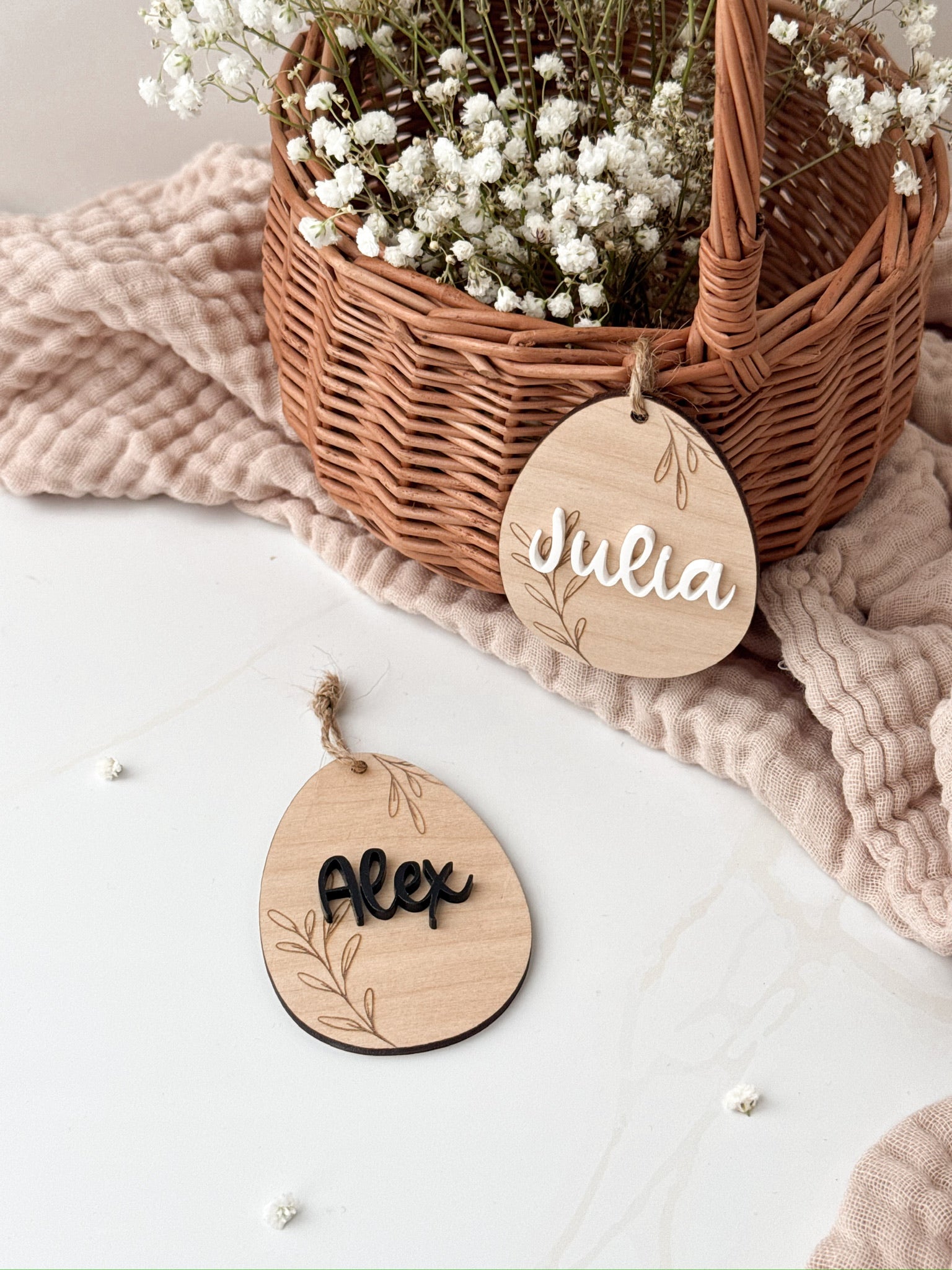 Entdecke unsere zauberhaften Osterkörbchen aus Vollweide und unsere personalisierten Ei-Anhängern aus Holz und Acryl - ein zeitloses Geschenk, das die Freude des Frühlings in dein Zuhause bringt. Verleihe deinem Osterfest eine ganz persönliche Note und freue dich auch in den nächsten Jahren immer wieder über unser nachhaltiges Osterkörbchen.