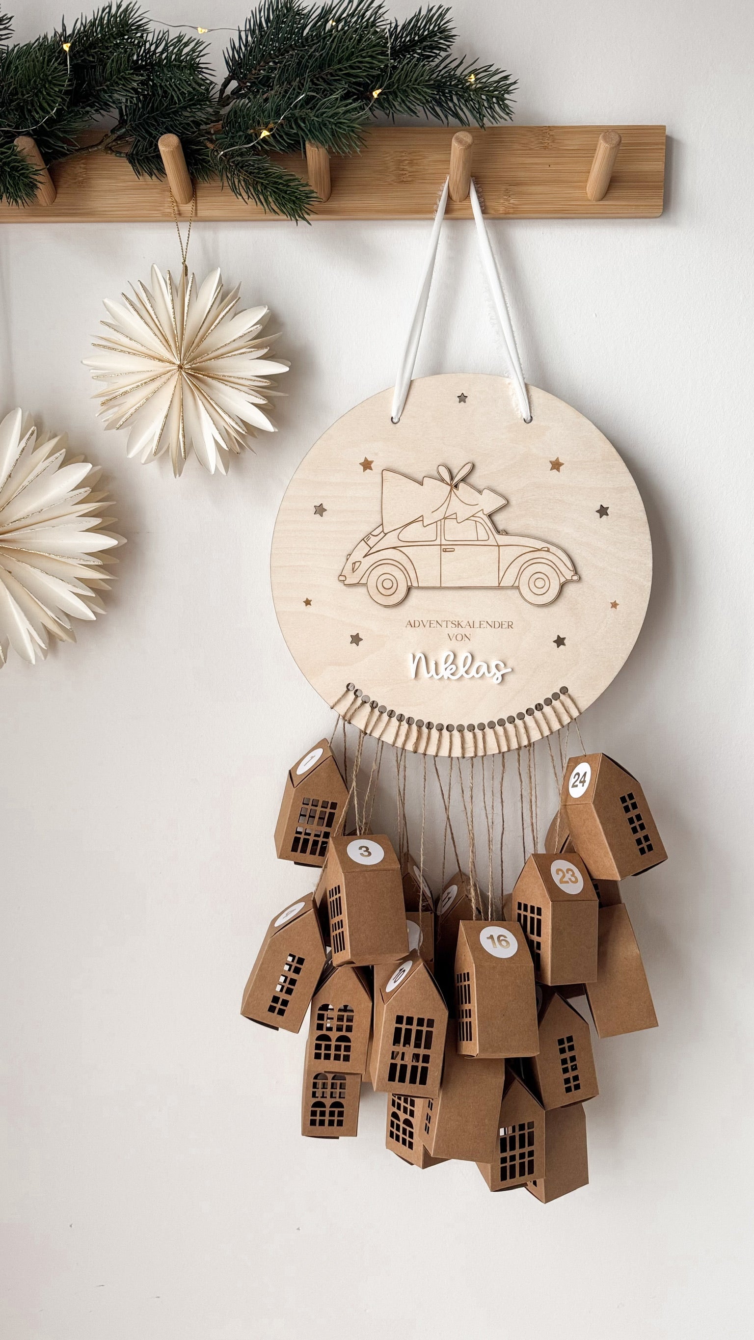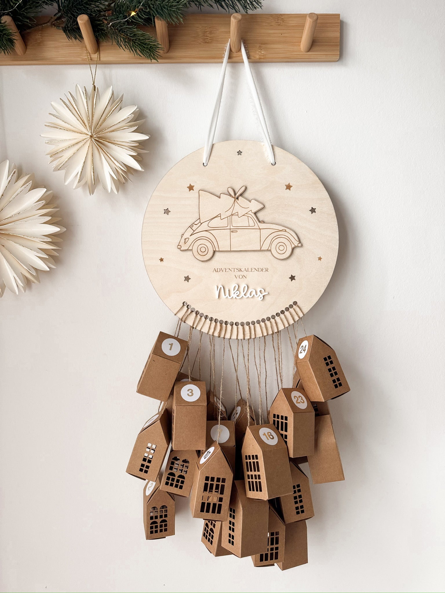 Entdecke die Magie der Vorweihnachtszeit mit unserem hochwertigen und personalisierten Adventskalender aus Holz mit winterlichem Auto zum Selbstbefüllen!